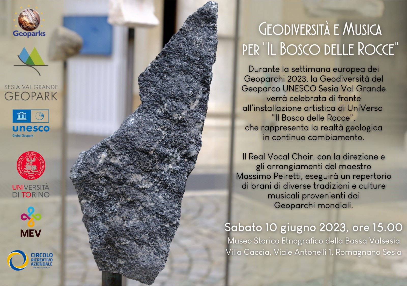 L'installazione multimediale di GEOdiversUNITO, realizzata ad ottobre 2022 a Torino nell’ambito del Progetto #Universo dedicato al tema della #Geodiversità, trova ora la sua collocazione definitiva presso Villa Caccia a Romagnano Sesia, sede del MEV il Museo Etnografico della bassa Valsesia. La mostra, denominata “Il bosco delle rocce” perché realizzata con rocce del territorio del Sesia Val Grande Geopark, viene presentata al MEV sabato 10 giugno 2023 alle ore 15, accompagnata da un concerto eseguito dal Real Vocal Choir diretto dal M° Massimo Peiretti.