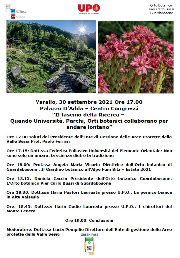 Si svolgerà il prossimo giovedì 30 settembre 2021, presso il Centro Congressi di Palazzo d’Adda a Varallo Sesia, un convegno, dal titolo: “Il fascino della Ricerca Quando Università, Parchi, Orti botanici collaborano per andare lontano”.