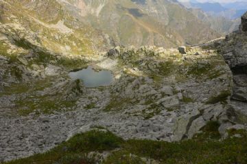 Lago di Baranca und an dessen linkem Ufer entlang, das mit einer schmalen Felsschwelle endet.