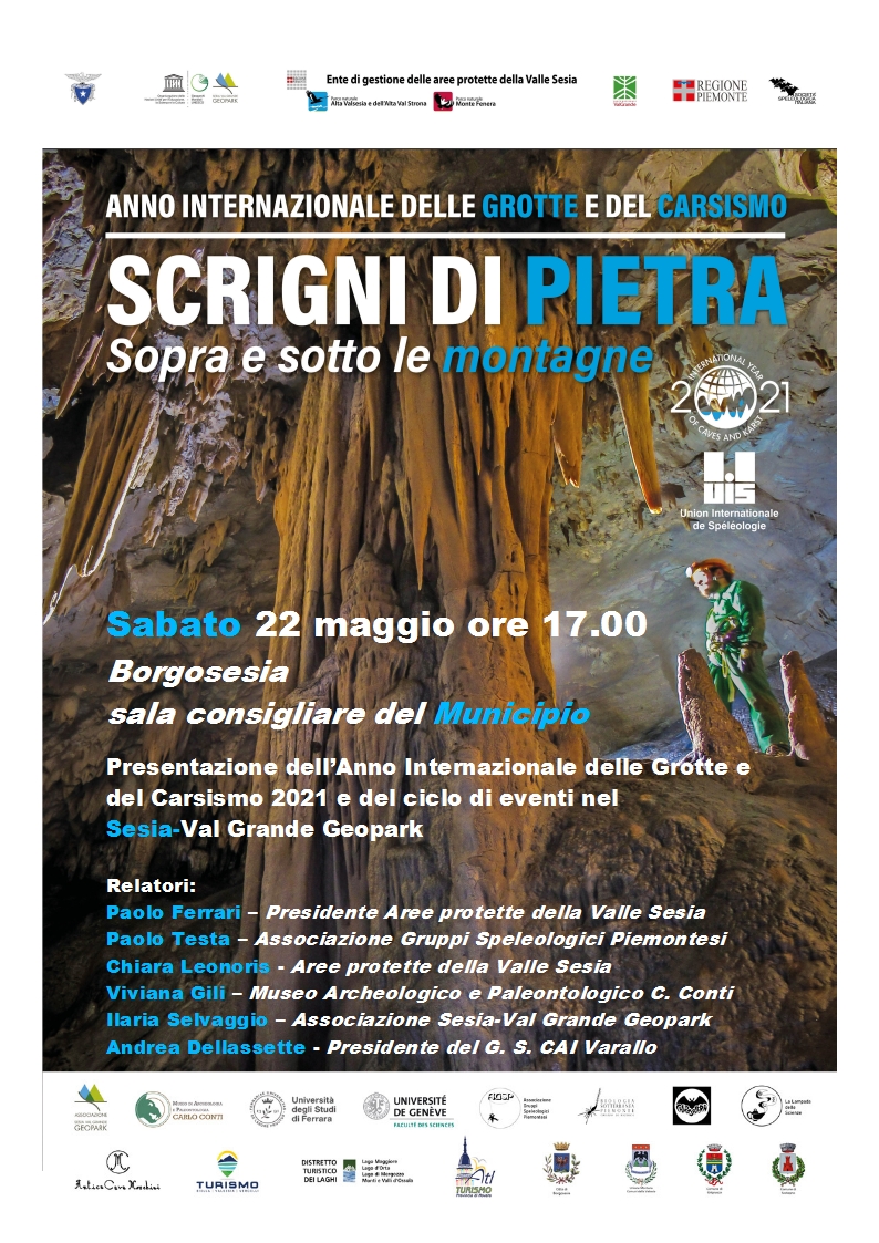 Sabato 22 maggio alle ore 17.00 presso la sala consigliare del Comune di Borgosesia verranno presentate le iniziative dell’Ente di Gestione delle Aree Protette della Valle Sesia ed il ciclo di eventi "Scrigni di Pietra" nel Sesia Valgrande Geopark, nell’ambito dell’Anno Internazionale delle Grotte e del Carsismo 2021