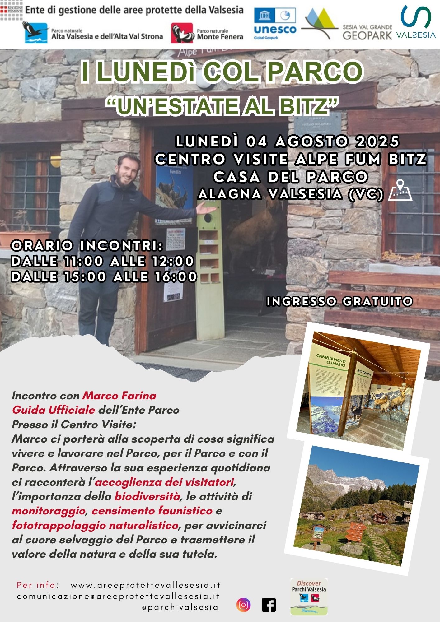 L’Ente di gestione delle Aree protette della Valsesia presenta “I Lunedì col Parco”, una nuova iniziativa estiva pensata per avvicinare il pubblico al cuore delle attività dell’Ente. Sei appuntamenti, tra la fine di luglio e l’inizio di settembre, distribuiti nei Centri Visite del Parco, in compagnia dei protagonisti che ogni giorno lavorano per tutelare e valorizzare il territorio.