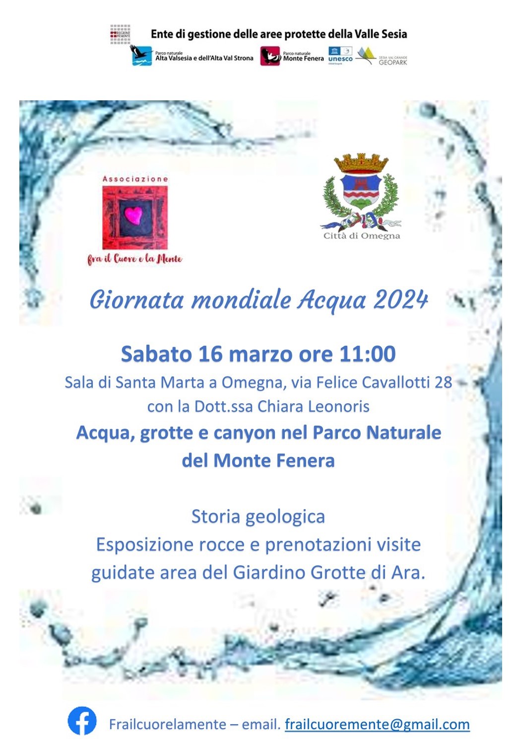 In occasione delle celebrazioni della Giornata Mondiale dell'Acqua, l'Ente di Gestione delle Aree protette della Valle Sesia parteciperà ad un incontro divulgativo ad Omegna sabato 16 marzo 2024 per presentare le caratteristiche e le peculiarità del sistema carsico del Parco Naturale del Monte Fenera, nel Sesia Val Grande Geopark, dove rocce, grotte e canyon raccontano una storia antica e recente di un'area singolare del nostro territorio, formata, modellata e plasmata dall'acqua.