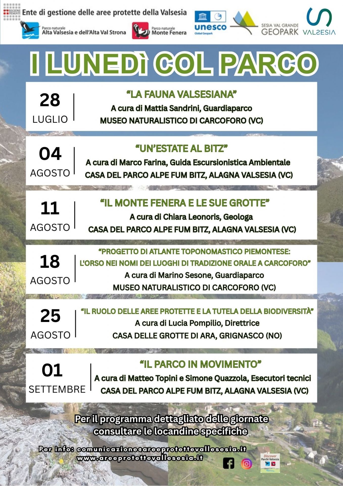 L’Ente di gestione delle Aree protette della Valsesia presenta “I Lunedì col Parco”, una nuova iniziativa estiva pensata per avvicinare il pubblico al cuore delle attività dell’Ente. Sei appuntamenti, tra la fine di luglio e l’inizio di settembre, distribuiti nei Centri Visite del Parco, in compagnia dei protagonisti che ogni giorno lavorano per tutelare e valorizzare il territorio.