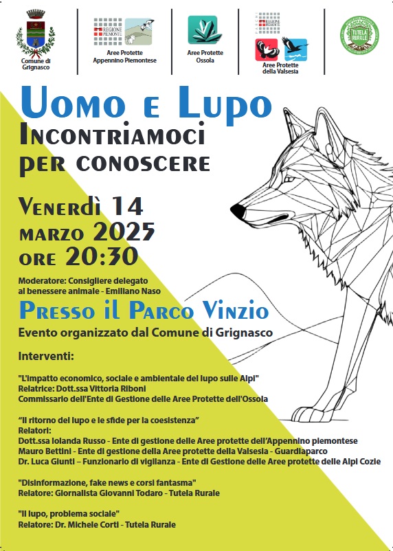 L'Ente Parco invita la cittadinanza a partecipare all’incontro organizzato dal Comune di Grignasco "Uomo e lupo: incontriamoci per conoscere", che si terrà venerdì 14 marzo 2025 alle ore 20:30 presso il Parco Vinzio di Grignasco (NO).