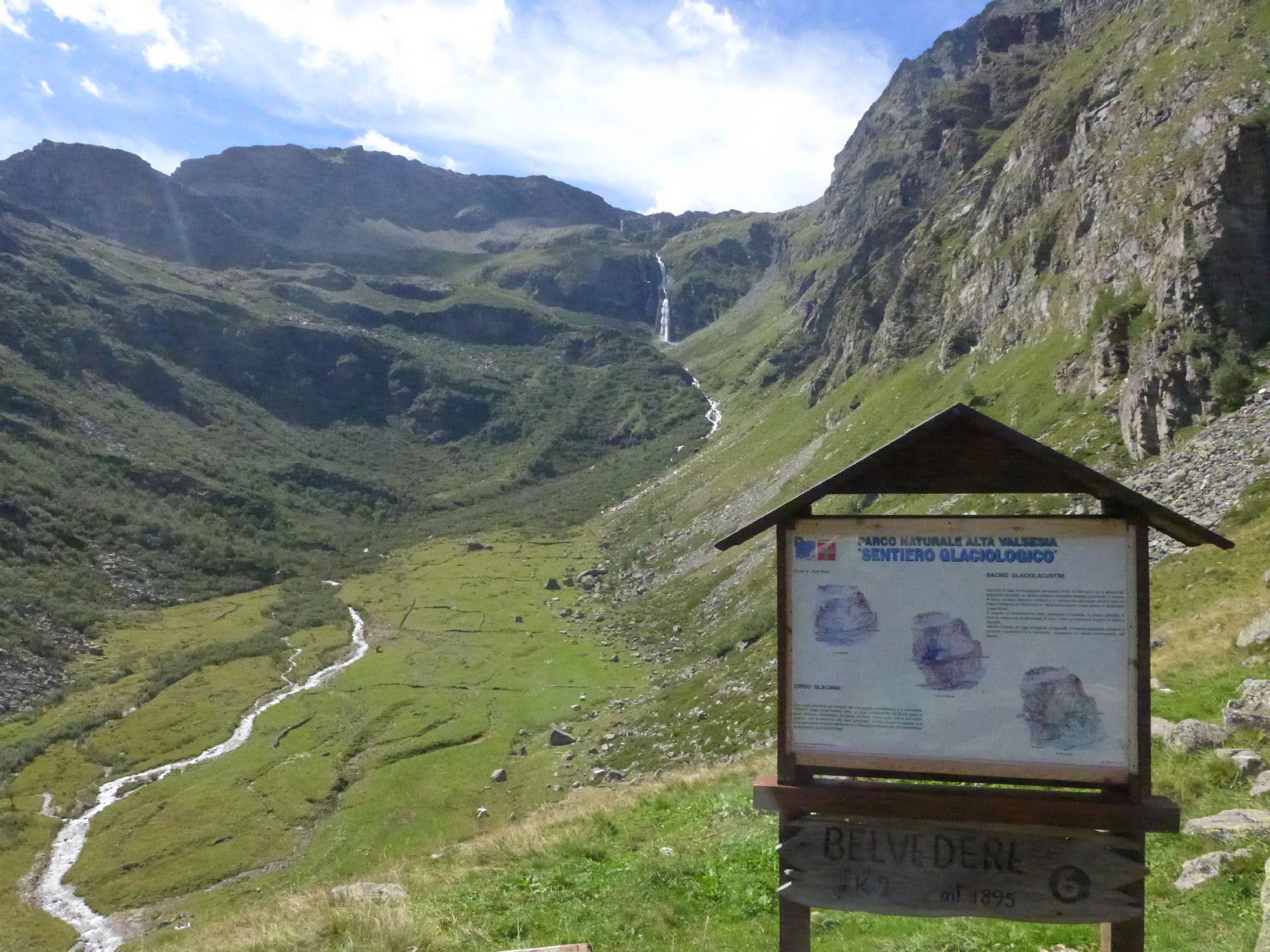 A tale scopo sono stati posizionati lungo il percorso 8 pannelli esplicativi forniti di testo, fotografie, grafici e disegni. Il “Sentiero glaciologico” si sviluppa nel comune di Alagna (VC); parte dalla località “Acqua Bianca”, a quota 1500 m e, lungo un comodo percorso della durata massima di 2 ore, raggiunge l’Alpe Fun D’Ekku (a quota 2070 m) dal quale si ha una splendida vista sui ghiacciai valsesiani e sui depositi morenici di età recente.