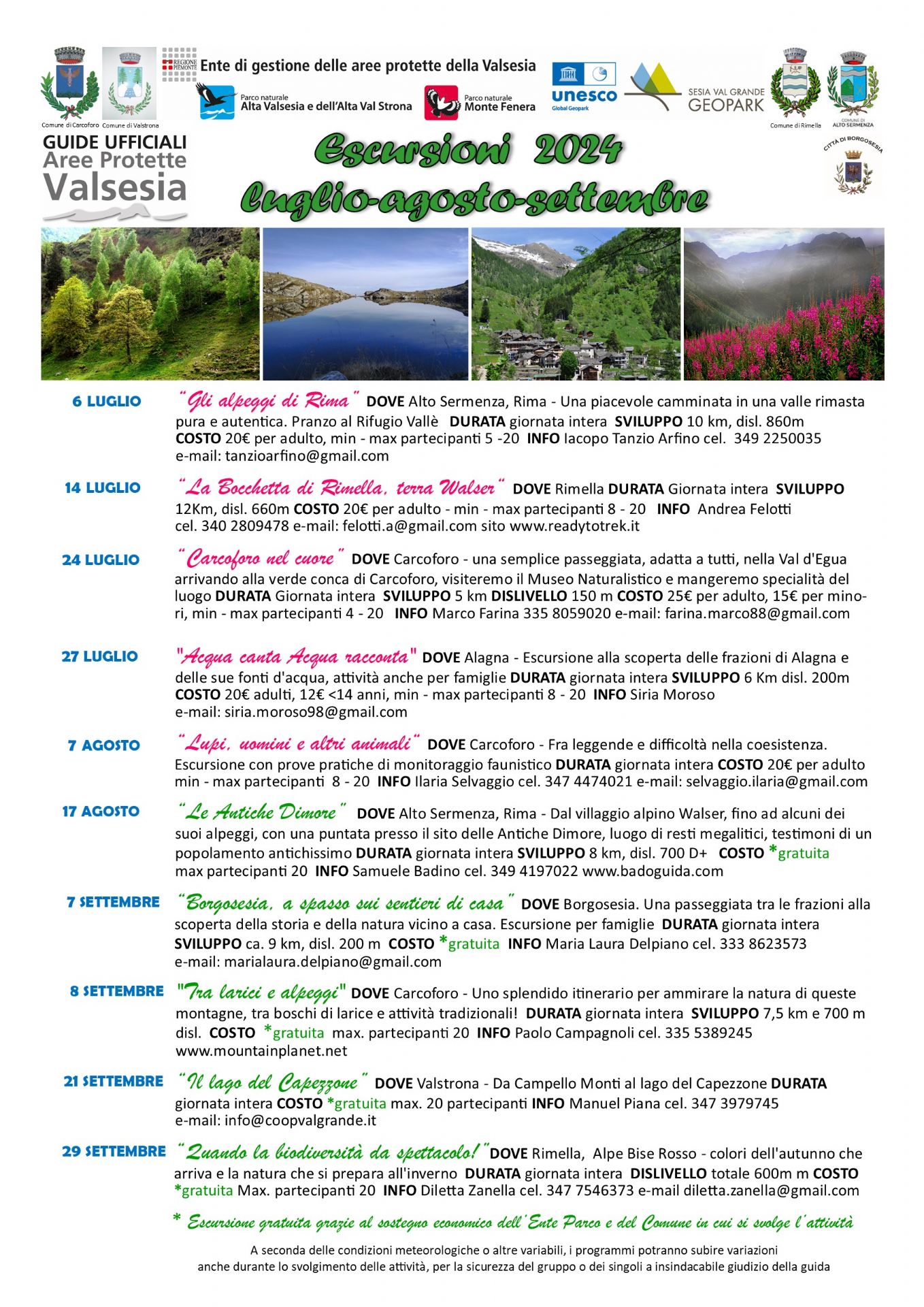 Approfittando della stagione calda, le altre 9 escursioni si svolgeranno alle testate della Valsesia, Val Sermenza, Val Mastallone e Valstrona tra lariceti, alpeggi, frazioni, laghi alpini e Villaggi Walser. Sarà inoltre possibile effettuare prove di monitoraggio faunistico.