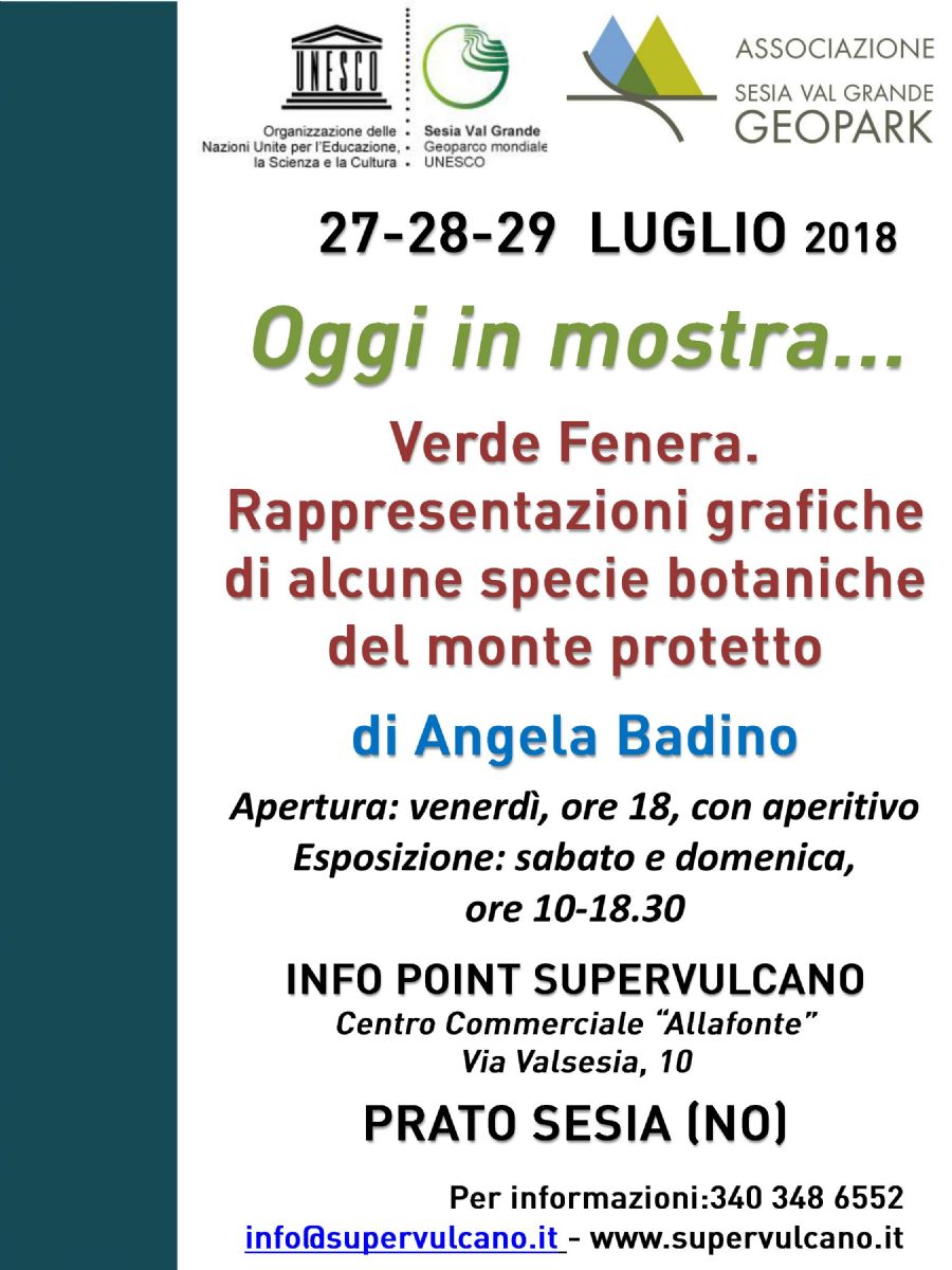 L'Associazione Sesia val Grande Geopark propone alla fine di luglio 2018 un'interessante mostra “Verde Fenera. Rappresentazioni grafiche di alcune specie botaniche del monte protetto” con opere eseguite da Angela Badino artista e studiosa che ha adottato una particolare tecnica nell'esecuzione di disegni di piante. L'artista, originaria di Chivasso, è laureata in Scienze Naturali all’Ateneo di Torino ed ha svolto attività di insegnante dal 1982 al 2007 in Italia e dal 2007 al 2016 nei licei italiani all’estero, per cui vive da alcuni anni tra Italia e Spagna.
