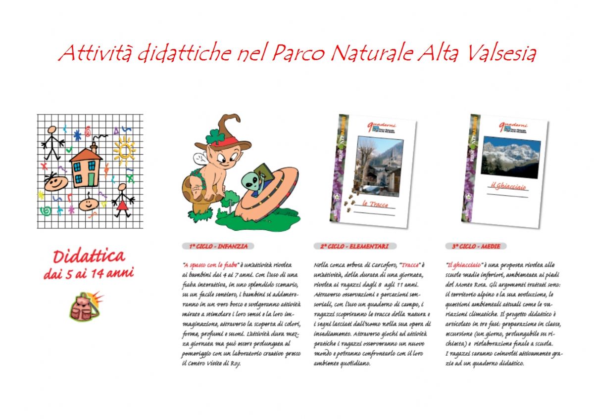 “Il ghiacciaio” è una proposta rivolta alle scuole medie inferiori, ambientata ai piedi del Monte Rosa. Gli argomenti trattati sono: il territorio alpino e la sua evoluzione, le questioni ambientali attuali come le variazioni climatiche. Il progetto didattico è articolato in tre fasi: preparazione in classe, escursione (un giorno, prolungabile su richiesta) e rielaborazione finale a scuola. I ragazzi saranno coinvolti attivamente grazie ad un quaderno didattico.