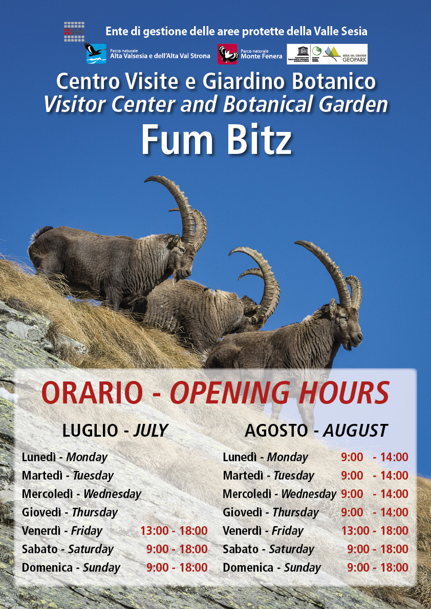 Il Centro Visite e Giardino Botanico siti all'Alpe Fum Bitz saranno aperti da venerdì 9 luglio con i seguenti orari: