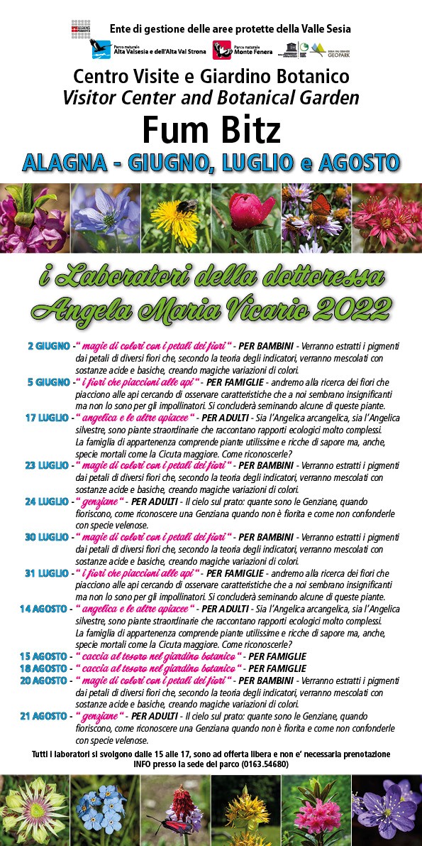 Vi presentiamo il calendario dei laboratori della dottoressa Angela Maria Vicario che si svolgeranno al Giardino botanico del Parco Valle Sesia a Fum Bitz questa estate.