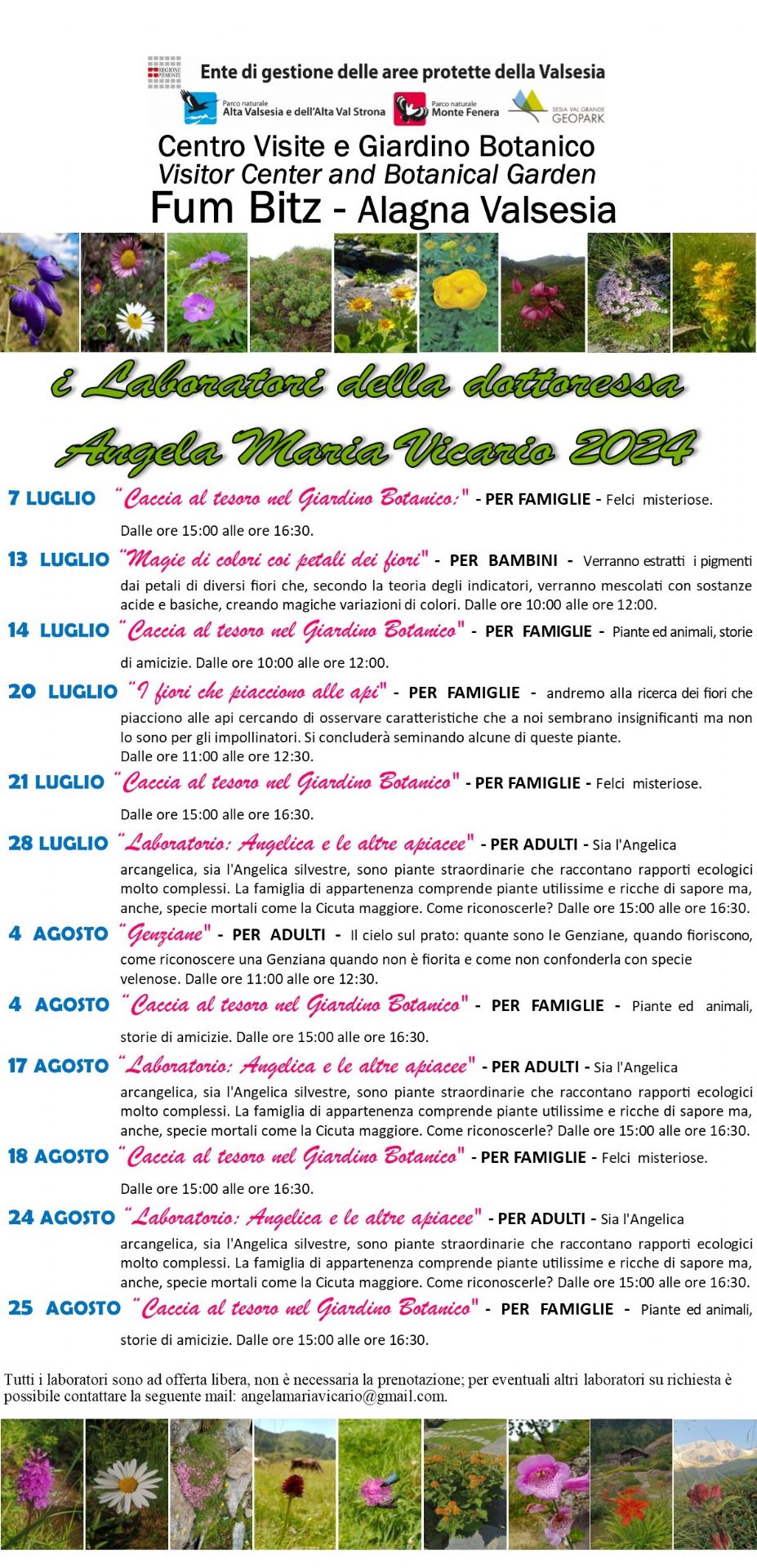 Siamo lieti di annunciare il nuovo calendario dei laboratori botanici che si terranno nel nostro splendido "Giardino Botanico" all'Alpe Fum Bitz, nel comune di Alagna Valsesia. Questi laboratori offrono un'opportunità unica per immergersi nel mondo della botanica, esplorando la straordinaria biodiversità del parco e approfondendo le proprie conoscenze sulle piante.