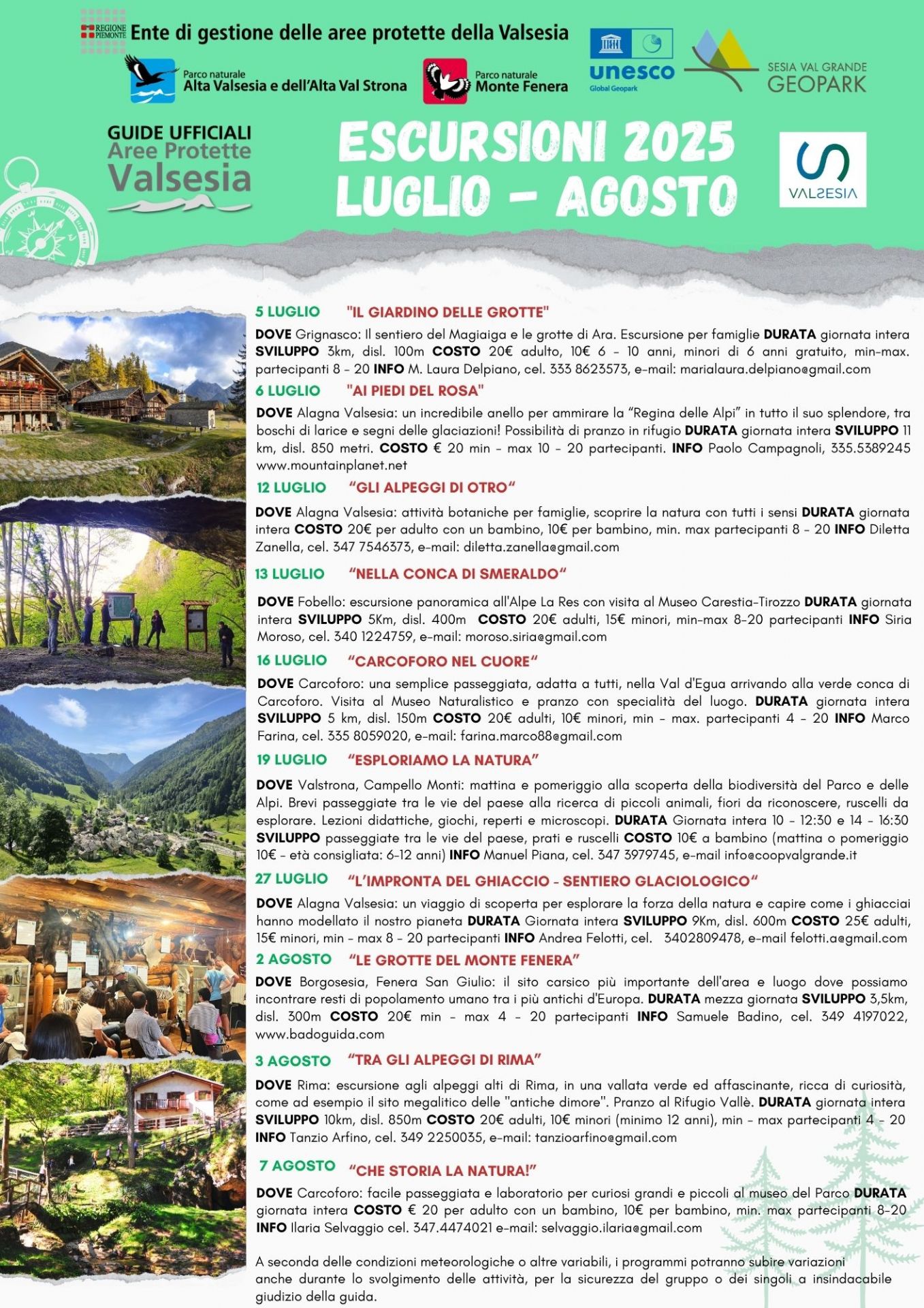 📅 Nei mesi di luglio e agosto, torna il calendario escursionistico curato dall'Ente di Gestione delle Aree Protette della Valsesia, con proposte per ogni gusto tra natura, storia e paesaggi mozzafiato.